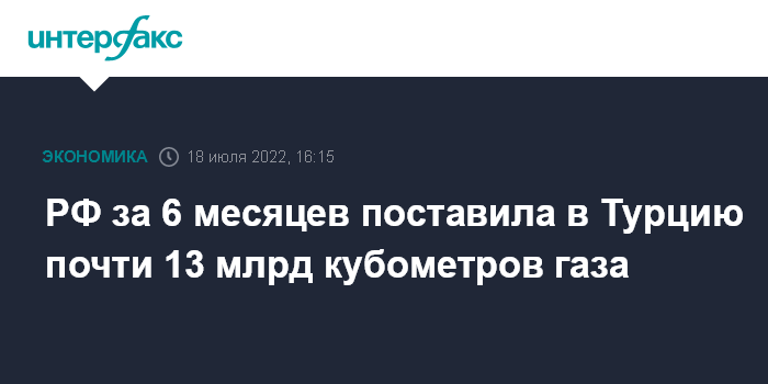 Москва. 18 июля. INTERFAX.RU - Россия за первое полугодие 2022 года поставила в Турцию почти 13 млрд кубометров газа. Об этом сообщил журналистам помощник президента РФ Юрий Ушаков на брифинге в преддверии визита Владимира Путина в Тегеран.