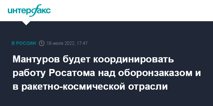 Москва. 18 июля. INTERFAX.RU - Премьер-министр РФ Михаил Мишустин закрепил за вице-премьером - министром промышленности и торговли Денисом Мантуровым новые обязанности, в частности, он будет координировать деятельность "Росатома" в части гособоронзаказа, ракетно-космической отрасли и атомного надзора.