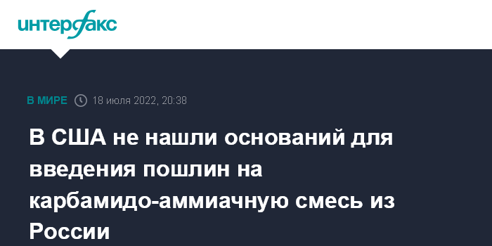 Москва. 18 июля. INTERFAX.RU - Комиссия по международной торговле США (ITC) признала, что импорт карбамидо-аммиачной смеси (КАС) из России, а также Тринидада и Тобаго не наносит ущерба местным производителям.