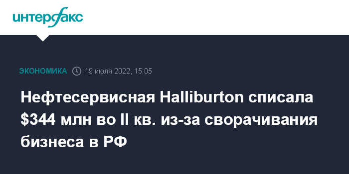 Москва. 19 июля. INTERFAX.RU - Американская нефтесервисная компания Halliburton Co. списала $344 млн во втором квартале 2022 года в результате сворачивания бизнеса в России, что негативно отразилось на ее чистой прибыли.