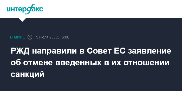 Москва. 19 июля. INTERFAX.RU - ОАО "РЖД" направило в Совет Европейского союза заявление об отмене введенных в ее отношении ограничений, сообщила компания в официальном телеграм-канале во вторник.