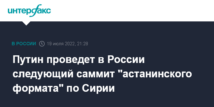 Москва. 19 июля. INTERFAX.RU - Следующая встреча глав государств - гарантов "астанинского процесса" по сирийскому урегулированию (России, Ирана и Турции) состоится в России, сообщил президент Владимир Путин на встрече в Тегеране с президентами Ирана и Турции Ибрахимом Раиси и Реджепом Тайипом Эрдоганом.