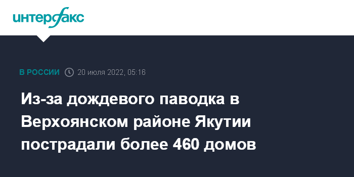 Как сообщалось, в начале июля из-за ливней в Верхоянском и Кобяйском районах поднялся уровень воды на реках. От паводковых вод пострадали несколько населенных пунктов, в них был введен режим ЧС регионального характера.