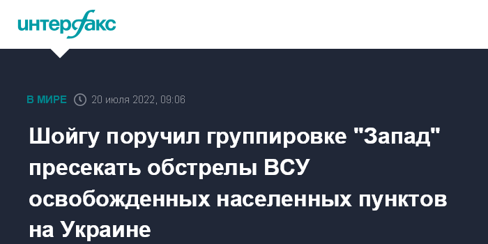 Шойгу поручил группировке "Запад" пресекать обстрелы ВСУ освобожденных населенных пунктов на Украине