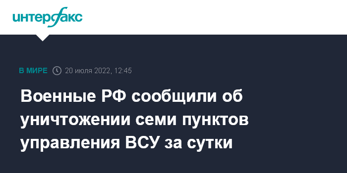 Москва. 20 июля. INTERFAX.RU - В ходе специальной военной операции на Украине оперативно-тактической и армейской авиацией, ракетными войсками и артиллерией за сутки поражено семь пунктов управления украинской армии, сообщил официальный представитель министерства обороны РФ Игорь Конашенков на брифинге в среду.
