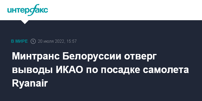Москва. 20 июля. INTERFAX.RU - Минтранс Белоруссии полностью не согласно с выводами Международной организации гражданской авиации ИКАО, отчет организации по инциденту с рейсом Ryanair "не выдерживает никакой критики", заявил "БелТА" директор департамента по авиации Минтранса Артем Сикорский.