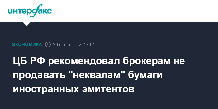 Москва. 20 июля. INTERFAX.RU - Банк России направил письмо брокерам с рекомендацией не продавать неквалифицированным инвесторам ценные бумаги иностранных эмитентов, в частности, заблокировать такую возможность в мобильных приложениях.