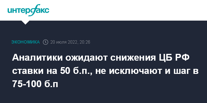 Москва. 20 июля. INTERFAX.RU - Большинство аналитиков ждут снижения ключевой ставки ЦБ РФ в ближайшую пятницу, 22 июля, на 50 базисных пунктов (б.п.) - до 9,0% годовых. Некоторые экономисты не исключают больших шагов снижения - на 75 б.п. (до 8,75%) или даже на 100 б.п. (до 8,5%).