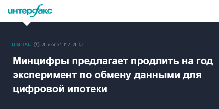 Москва. 20 июля. INTERFAX.RU - Минцифры РФ предлагает продлить до декабря 2023 года эксперимент по обмену данными для проведения ипотечных сделок в цифровом формате.