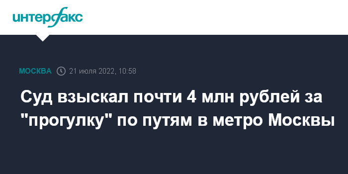 Москва. 21 июля. INTERFAX.RU - В Москве Черемушкинский районный суд взыскал почти 4 млн рублей с пассажира, который специально спустился на рельсы и собирался уйти в туннель, сообщил городской Департамент транспорта.