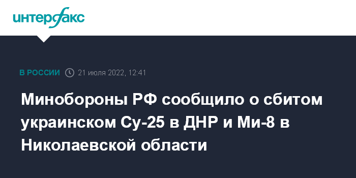 Минобороны РФ сообщило о сбитом украинском Су-25 в ДНР и Ми-8 в Николаевской области