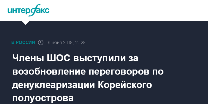 Москва. 16 июня. INTERFAX.RU - Государства-члены ШОС в принятой Екатеринбургской декларации выступили "за возобновление переговорного процесса по денуклеаризации Корейского полуострова". В декларации в связи с этим отмечается, что члены ШОС "призывают проявлять сдержанность и продолжить поиск взаимоприемлемых развязок на основе ранее достигнутых договоренностей".