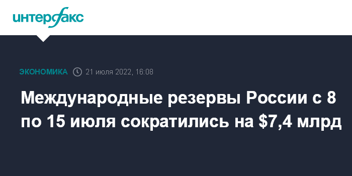 Международные резервы России с 8 по 15 июля сократились на $7,4 млрд