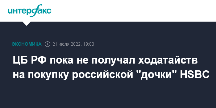 Москва. 21 июля. INTERFAX.RU - Банк России пока не получал ходатайств на покупку российского дочернего банка британского HSBC, соответственно возможность заключения этой сделки регулятор сейчас не изучает, сообщили журналистам в пресс-службе ЦБ.