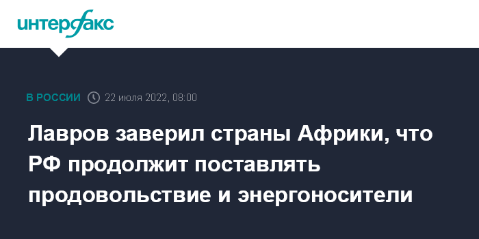 "Россия продолжит добросовестно выполнять свои обязательства по международным контрактам в части экспортных поставок продовольствия, удобрений, энергоносителей, других жизненно необходимых Африке товаров. Все меры для этого с российской стороны предпринимаются", - говорится в его статье для африканских СМИ, опубликованной в пятницу на сайте российского внешнеполитического ведомства.