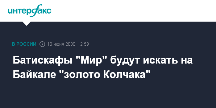 Москва. 16 июня. INTERFAX.RU - Легендарное "золото Колчака" продолжат искать участники второго сезона научной экспедиции "Миры" на Байкале", стартовавшей накануне в Иркутской области.