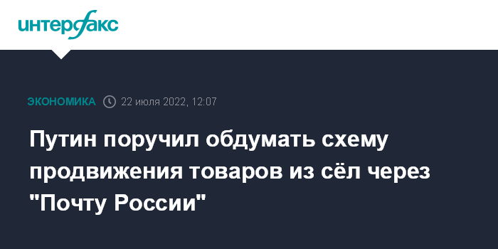 Москва. 22 июля. INTERFAX.RU - Президент Владимир Путин поручил правительству и АО "Почта России" с участием заинтересованных организаций подготовить предложения по созданию системы продвижения и продажи товаров, произведенных мелким и средним бизнесом и самозанятыми из малых городов и сёл, через маркетплейсы и отделения почтовой связи.