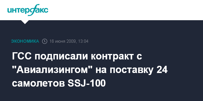 Москва. 16 июня. INTERFAX.RU - ЗАО "Гражданские самолеты Сухого" (ГСС) в рамках авиасалона Ле Бурже подписало твердый контракт с российской лизинговой компанией "Авиализинг" на поставку 24 самолетов Sukhoi SuperJet-100 (SSJ-100), передал корреспондент "Интерфакса" с церемонии подписания. Стоимость контракта составляет $715 млн. Предварительное соглашение о намерениях было подписано сторонами год назад в рамках авиасалона в Фарнборо.
