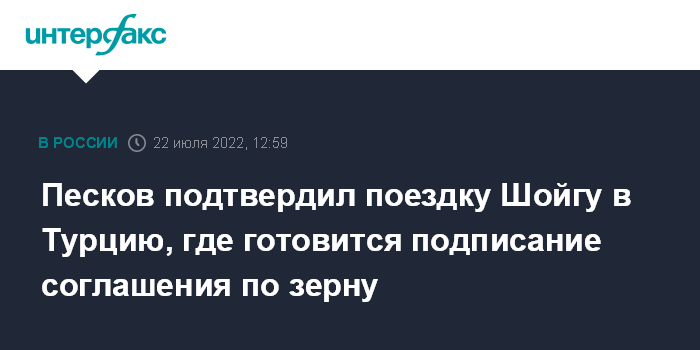 Песков подтвердил поездку Шойгу в Турцию, где готовится подписание соглашения по зерну