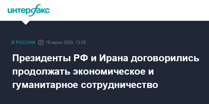 Москва. 16 июня. INTERFAX.RU - Встреча президента России Дмитрия Медведева с президентом Ирана Махмудом Ахмадинежадом состоялась на полях саммита ШОС в Екатеринбурге, сообщила пресс-секретарь главы российского государства Наталья Тимакова. Стороны договорились о продолжении экономического и гуманитарного сотрудничества, продолжении контактов.