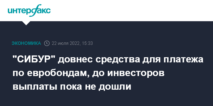 Москва. 22 июля. INTERFAX.RU - "СИБУР", разделивший платеж по евробондам-2025, чтобы довести выплаты до инвесторов, чьи права учитываются российским НРД, довнес средства, но до инвесторов купонный доход пока так и не дошел, следует из сообщения эмитента еврооблигаций - SIBUR Securities DAC.