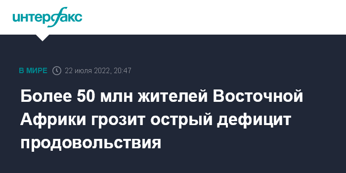 Москва. 22 июля. INTERFAX.RU - Свыше 50 млн жителей Восточной Африки могут столкнуться в этом году с чрезвычайным дефицитом продовольствия. Об этом сообщает Associated Press (AP) со ссылкой на восточноафриканское Межправительственное управление по вопросам развития (IGAD).
