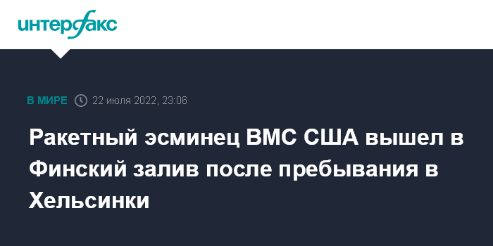Москва. 22 июля. INTERFAX.RU - Американский ракетный эсминец USS Arleigh Burke, находившийся со вторника в порту финской столицы Хельсинки для пополнения запасов, в пятницу вышел в море, сообщил 6-й оперативной флот США.