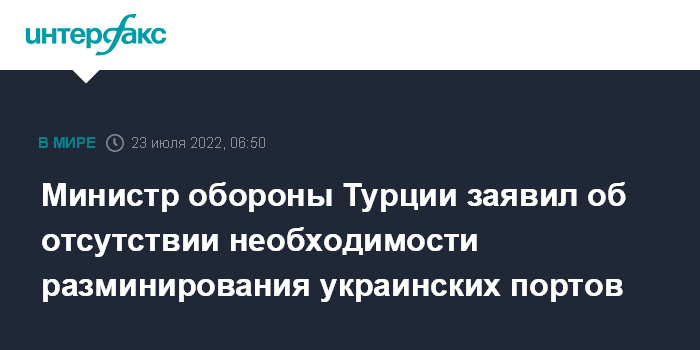 Москва. 23 июля. INTERFAX.RU - Для начала работы по вывозу зерна в полном разминировании украинских черноморских портов необходимости нет, достаточно создания безопасных коридоров для прохождения торговых кораблей, считает турецкий министр обороны Хулуси Акар.