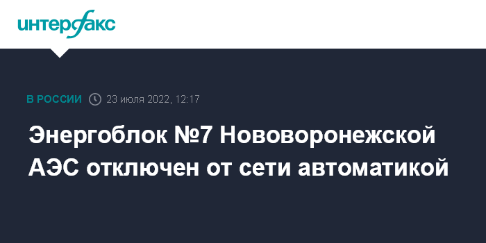 "23 июля 2022 года в 09:55 (мск) энергоблок №7 Нововоронежской АЭС отключен от сети действием электрических защит турбогенератора. После устранения причины и проведения ремонтных работ энергоблок будет снова включен в сеть", - говорится в сообщении.