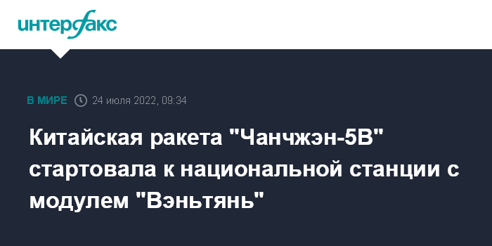 Москва. 24 июля. INTERFAX.RU - Китайская ракета-носитель "Чанчжэн-5B" в воскресенье стартовала к национальной орбитальной станции "Тяньгун" с экспериментальным модулем "Вэньтянь", который войдёт в состав орбитальной группировки станции. Трансляцию запуска ведёт Центральное телевидение Китая (CCTV).