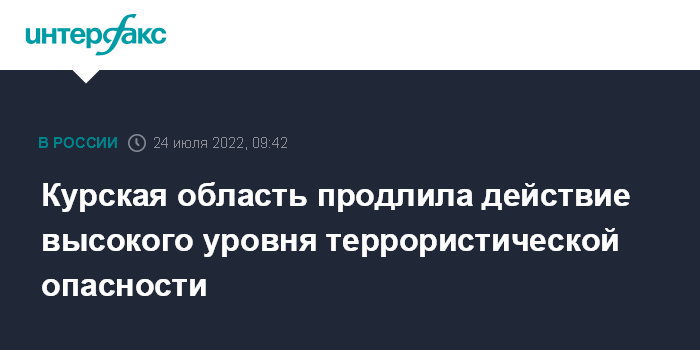 Москва. 24 июля. INTERFAX.RU - Губернатор Курской области Роман Старовойт сообщил о продлении в регионе "желтого" (высокого) уровня террористической опасности.