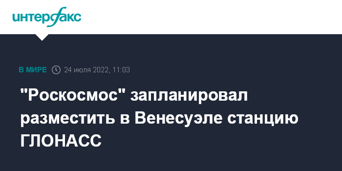 Москва. 24 июля. INTERFAX.RU - "Роскосмос" планирует разместить в Венесуэле измерительную станцию системы ГЛОНАСС, сообщили в воскресенье в госкорпорации.