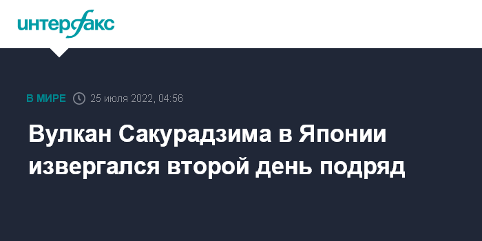 Москва. 25 июля. INTERFAX.RU - Вулкан Сакурадзима в префектуре Кагосима на юго-западе Японии извергался рано утром в понедельник второй день подряд, сообщают местные СМИ.