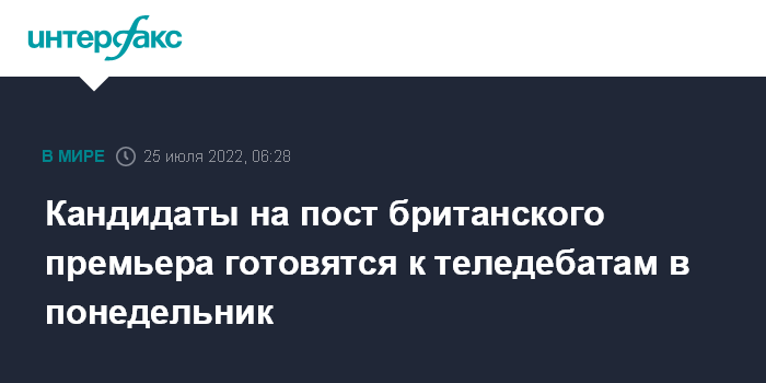 Москва. 25 июля. INTERFAX.RU - В понедельник оставшиеся в гонке за пост лидера Консервативной партии Великобритании и, соответственно, премьер-министра Соединенного Королевства бывший глава британского Минфина Риши Сунак и министр иностранных дел Лиз Трасс встретятся лицом к лицу на теледебатах, которые в прямом эфире будет транслировать телерадиокорпорация "Би-би-си".