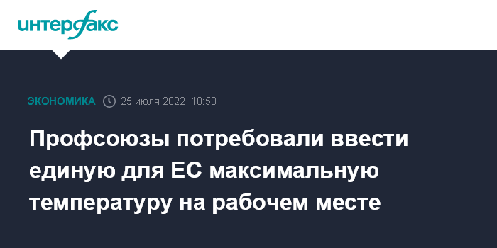Москва. 25 июля. INTERFAX.RU - Европейская конфедерация профсоюзов (CES) призвала принять закон, который установит для всего Евросоюза предельно допустимую температуру на рабочем месте, пишет Le Figaro.