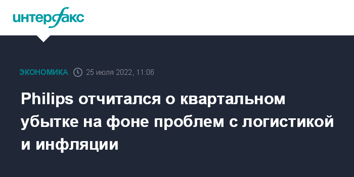Москва. 25 июля. INTERFAX.RU - Нидерландский производитель потребительских товаров и медицинского оборудования Royal Philips NV зафиксировал чистый убыток во втором квартале 2022 года из-за сохраняющихся проблем в глобальных цепочках поставок, ковид-ограничений в Китае, инфляционного давления и российско-украинского конфликта.