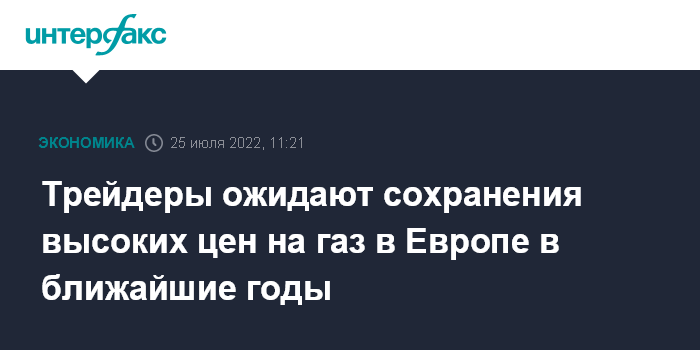 Москва. 25 июля. INTERFAX.RU - Цены на природный газ в Европе останутся высокими в ближайшие годы на фоне сохранения дефицита предложения, полагают трейдеры.