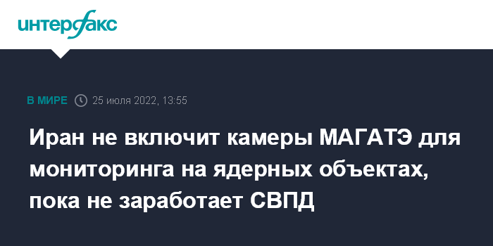 Москва. 25 июля. INTERFAX.RU - Тегеран не будет активировать работу камер МАГАТЭ, применяемых для мониторинга на иранских ядерных объектах, пока партнеры по Совместному всеобъемлющему плану действий (СВПД) не восстановят действие этого соглашения, передают западные СМИ со ссылкой на иранскую Организацию по атомной энергии.