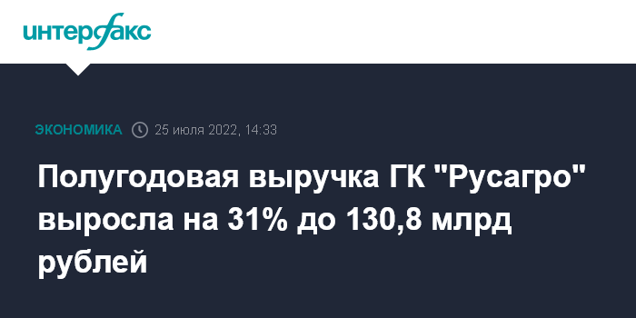 Москва. 25 июля. INTERFAX.RU - Выручка ГК "Русагро" (AGRO), одного из ведущих агрохолдингов России, во втором квартале этого года (до межсегментных элиминаций) составила 66,956 млрд рублей, что на 17% больше, чем в апреле-июне 2021 года, , сообщает компания. В I полугодии выручк группыа выросла на 31%, до 130,8 млрд рублей.
