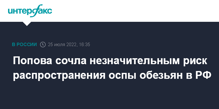 Москва. 25 июля. INTERFAX.RU - Риск распространения оспы обезьян в России невелик, заявила глава Роспотребнадзора Анна Попова.