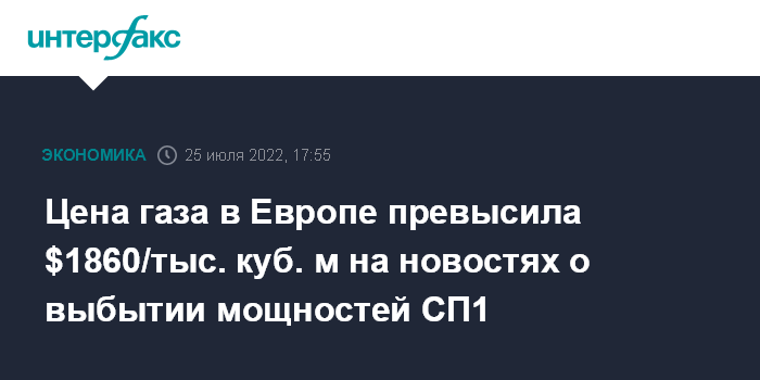 Москва. 25 июля. INTERFAX.RU - Спотовая цена газа в Европе превысила $1860/тыс. куб. м на новостях о новом выбытии мощностей газопровода "Северный поток".