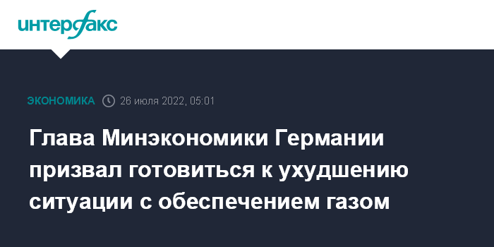Москва. 26 июля. INTERFAX.RU - Вице-канцлер, министр по делам экономики и защиты климата Германии Роберт Хабек назвал ситуацию с обеспечением газа в стране "серьезной" и призвал к сокращению его потребления на 15-20%.