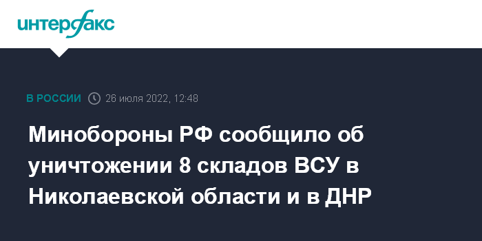 Москва. 26 июля. INTERFAX.RU - Российские военные за сутки уничтожили восемь оружейных складов вооруженных сил Украины в Николаевской области и на территории Донецкой народной республики, заявил официальный представитель Минобороны РФ Игорь Конашенков.