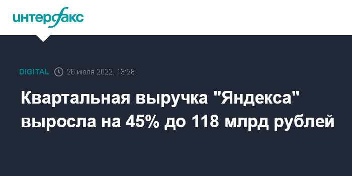 Москва. 26 июля. INTERFAX.RU - Во II квартале 2022 года выручка "Яндекса" выросла в годовом исчислении на 45% и составила 118 млрд рублей, говорится в отчете компании.