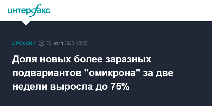 Москва. 26 июля. INTERFAX.RU - Доля новых, более заразных подвариантов "омикрон"-штамма COVID-19 ВА.4 и ВА.5 за две недели выросла до 75%, показатель заболеваемости коронавирусом в стране оказался на 50% выше, чем в среднем за последние четыре недели, сообщили в Роспотребнадзоре.