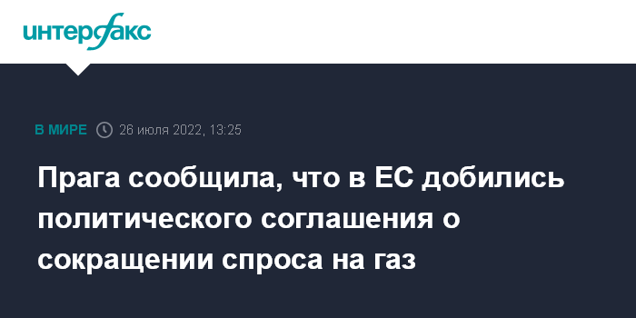 Москва. 26 июля. INTERFAX.RU - Министры стран ЕС во вторник смогли заключить политическое соглашение о сокращении потребления газа Евросоюзом, сообщили во вторник власти Чехии, председательствующей на данный момент в Совете ЕС.