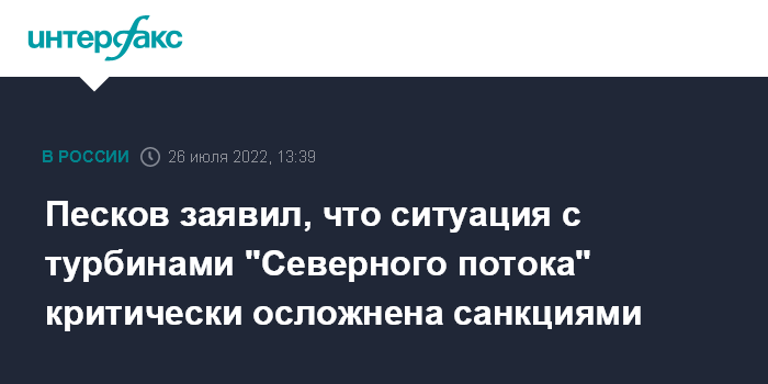 "Мы обязательно попросим наших коллег в "Газпроме" с технологической точки зрения дать объяснения. В целом, ещё раз повторяю: да, действительно, есть неполадки с турбинами. Турбина после капремонта (в Канаде - ИФ) ещё не пришла, не установлена, она в пути. Будем надеяться, что это произойдёт (скорее - ИФ) раньше, чем позже. Но есть и определённые неполадки с другой турбиной. "Газпром" работает над этой ситуацией. Ситуация критически осложняется теми ограничениями и санкциями, которые введены против нашей страны. Не будь этих ограничений, все ремонтные, гарантийные и сервисные работы осуществлялись бы в обычном, рутинном, оперативном порядке, не проводя к таким ситуациям, какие мы видим сейчас", - сказал Песков.