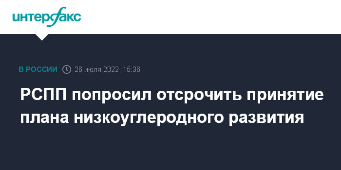 Москва. 26 июля. INTERFAX.RU - Российский союз промышленников и предпринимателей (РСПП) направил в правительство обращение с просьбой перенести на первое полугодие 2023 года принятие плана реализации низкоуглеродной стратегии РФ до 2050 года.