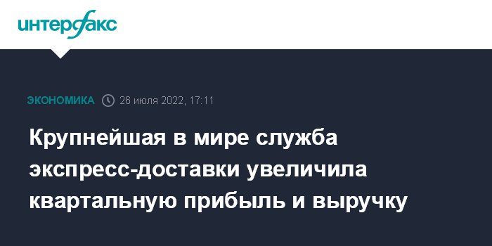 Москва. 26 июля. INTERFAX.RU - Крупнейшая в мире служба экспресс-доставки United Parcel Service во втором квартале 2022 года увеличила чистую прибыль и выручку, причем скорректированная прибыль и выручка оказались чуть выше прогнозов рынка.