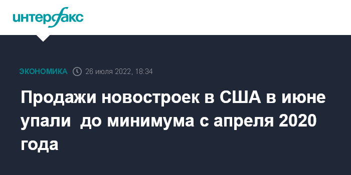 Москва. 26 июля. INTERFAX.RU - В июне 2022 года продажи новых домов в США упали на 8,1% к маю и составили 590 тысяч, что стало минимумом с апреля 2020 года, сообщило Министерство торговли страны.